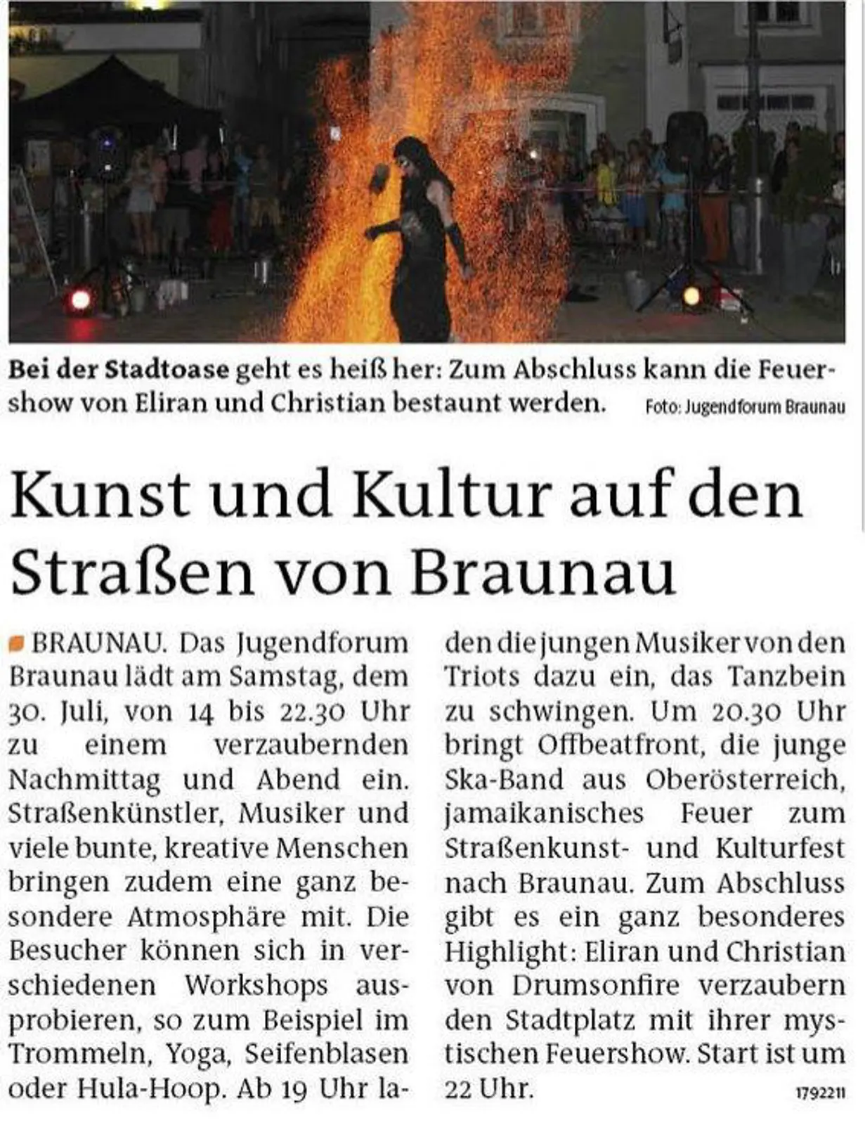 Bereits zum dritten Mal fand am Samstag den 30. Juli 2016 am Braunauer Stadtplatz das kleine Straßenkunstfest Stadtoase statt. Einen Tag lang verzauberten unterschiedlichste Künstler mit Musik, Jonglieren, Artistik und Feuershows große und kleine Besucher.